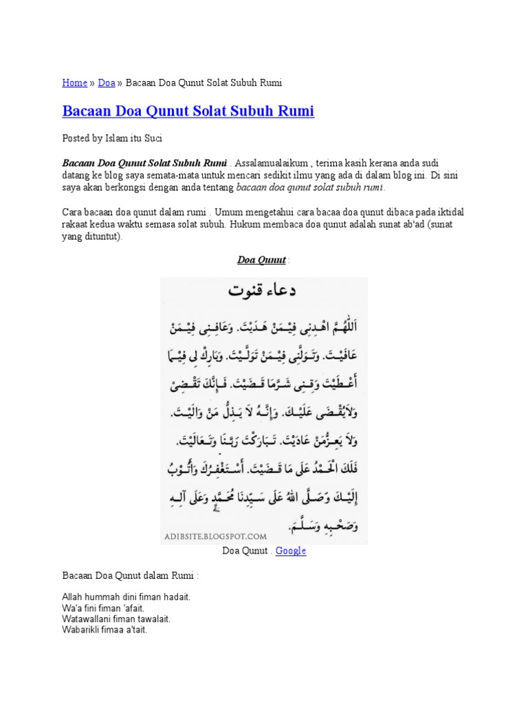 Doa Qunut Solat Subuh Rumi : Perkara ini sering berlaku kepada kita ketika solat subuh iaitu terlupa untuk baca doa qunut dan terus sujud. Doa Qunut Solat Subuh Rumi / Malah panduan untuk qunut nazilah juga turut disediakan.