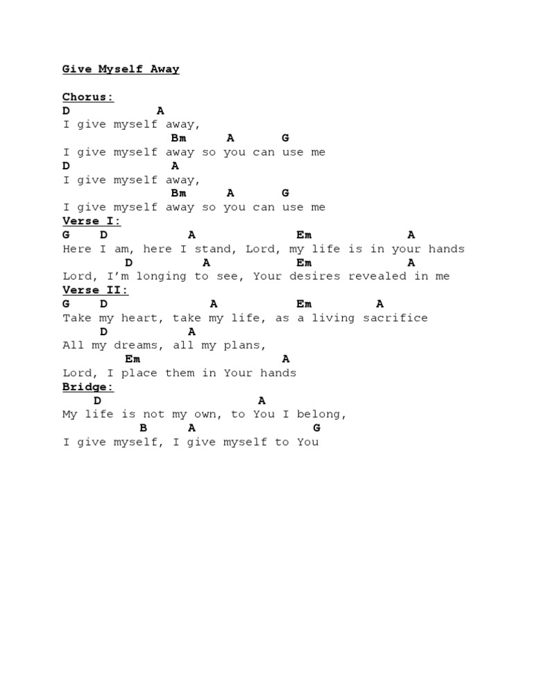 Give Myself Away Chords - verse 1: here i am here i stand lord, my life is in your hands lord, i'm longing to see your desires revealed in me i give myself away.